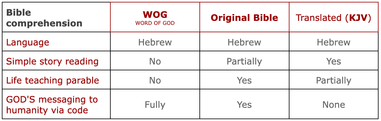 First-ever in history: the discovery of the authentic and original WORD OF GOD (WOG) which is composed of 1,197,000 Hebrew letters without any spaces, similar to the design of human DNA, which was also created by GOD. The structure, words, and each letter of WOG are encoded with scientific data and messaging to humanity. Each of the 22 Hebrew letters is encoded with two unique numbers between 1 and 510, which means every word in WOG has a hidden meaning for humanity. While ordinary individuals may benefit from GOD’s Bible through parables, the Original Bible Foundation can reveal the highly advanced and coded scientific data behind this revelation, which indicates its divine origin, as defined by the concept of the nonreligious GOD.