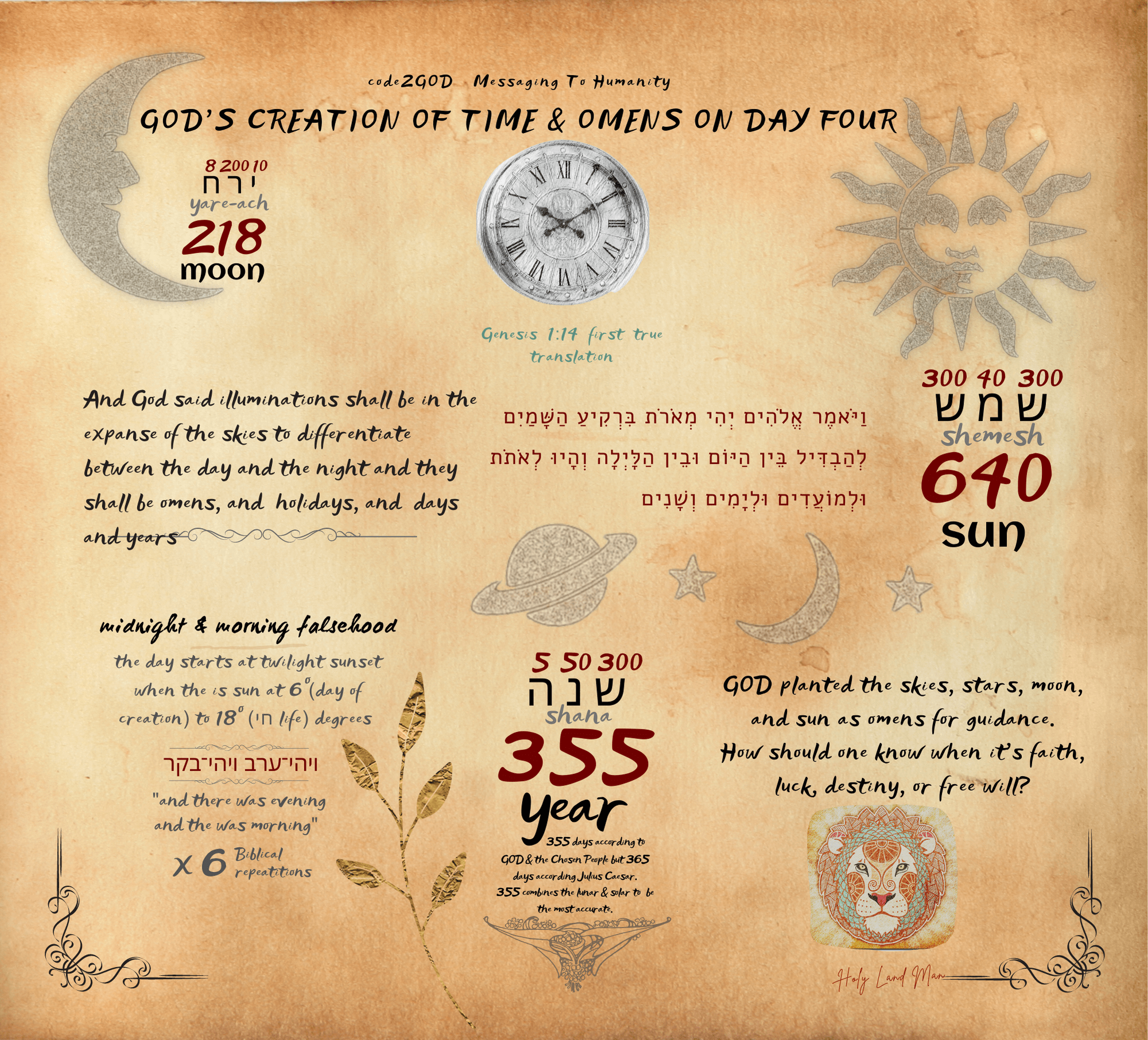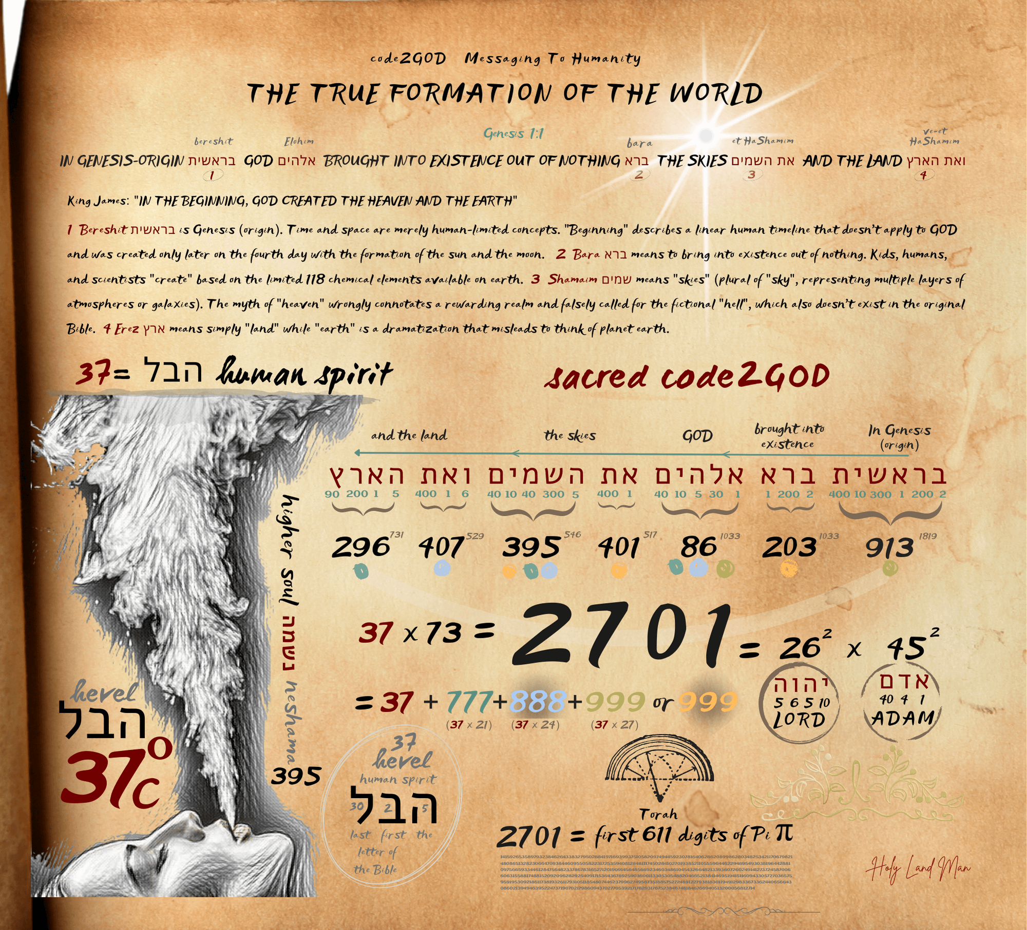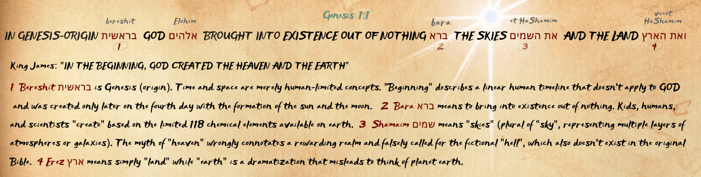 1 Bereshit בראשית is Genesis (origin). Time and space are merely human-limited concepts. “Beginning” describes a linear human timeline that doesn’t apply to GOD and was created only later on the fourth day with the formation of the sun and the moon. 2 Bara ברא means to bring into existence out of nothing. Kids, humans, and scientists “create” based on the limited 118 chemical elements available on earth. 3 Shamaim שמים means “skies” (plural of “sky”, representing multiple layers of atmospheres or galaxies). The myth of “heaven” wrongly connotates a rewarding realm and falsely called for the fictional “hell”, which also doesn’t exist in the original Bible. 4 Erez ארץ means simply “land” while “earth” is a dramatization that misleads to think of planet earth.