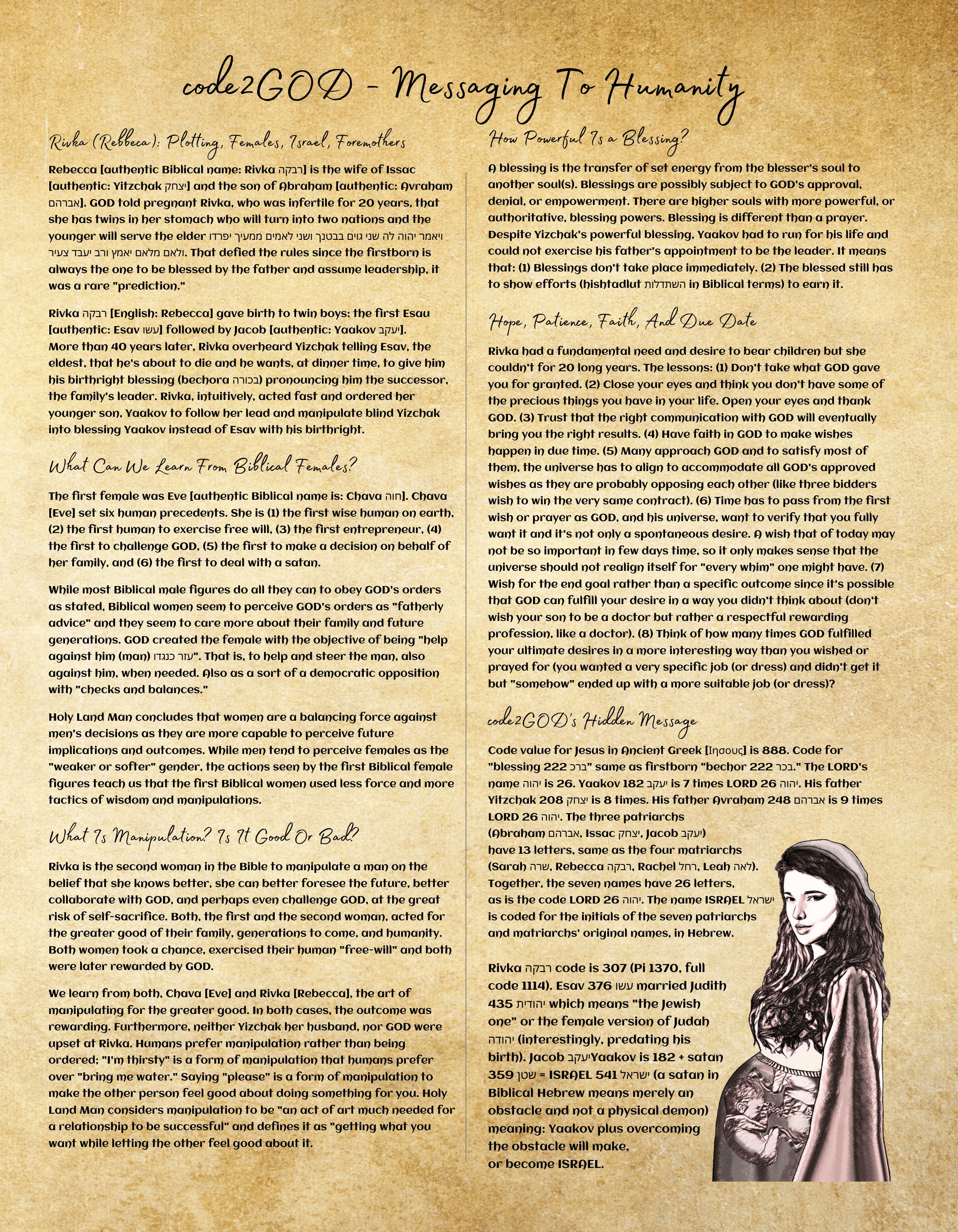 Rebecca [authentic Biblical name: Rivka רבקה] is the wife of Issac [authentic: Yitzchak יצחק] and the son of Abraham [authentic: Avraham אברהם]. GOD told pregnant Rivka, who was infertile for 20 years, that she has twins in her stomach who will turn into two nations and the younger will serve the elder ויאמר יהוה לה שני גוים בבטנך ושני לאמים ממעיך יפרדו ולאם מלאם יאמץ ורב יעבד צעיר. That defied the rules since the firstborn is always the one to be blessed by the father and assume leadership, it was a rare “prediction.”