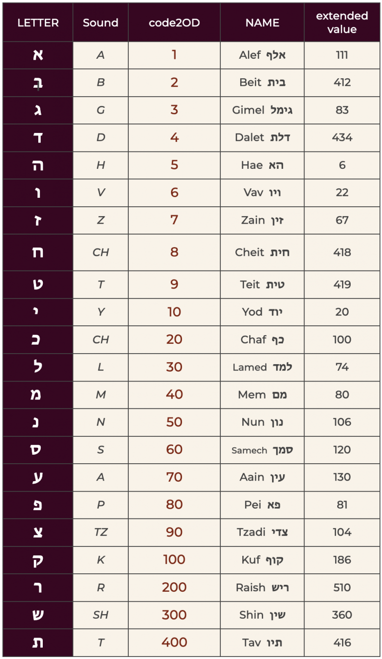 The process of divine creation began with the formation of the 22 Hebrew letters, each of which was assigned two distinctive numerical values ranging from 1 to 510 (1 to 400 in code#1 and 1 to 510 in code#2). This marked the inception of a profound and deeply symbolic system that would underpin the subsequent development of the Hebrew language.