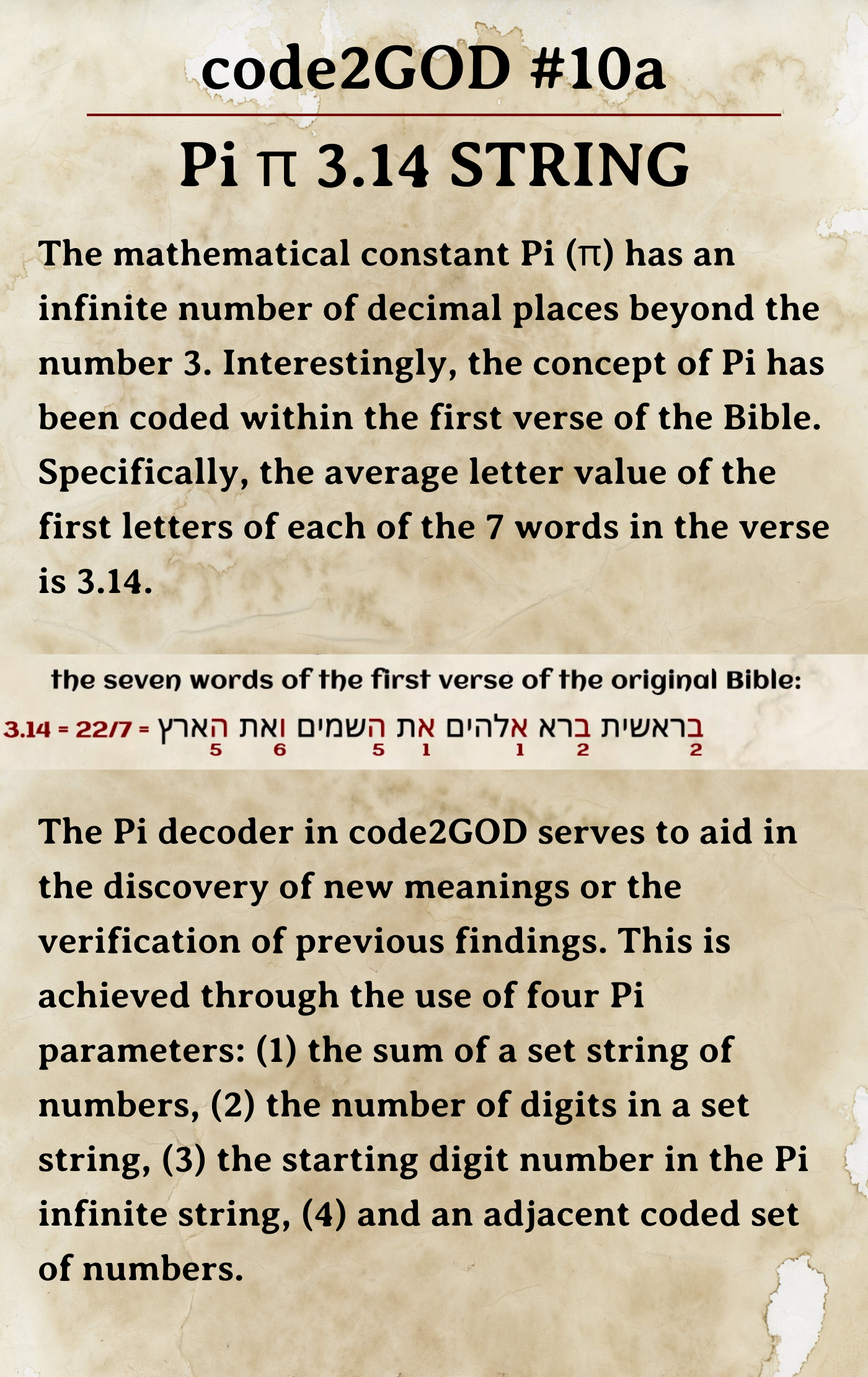 The Pi decoder in code2GOD serves to aid in the discovery of new meanings or the verification of previous findings. This is achieved through the use of four Pi parameters: (1) the sum of a set string of numbers, (2) the number of digits in a set string, (3) the starting digit number in the Pi infinite string, (4) and an adjacent coded set of numbers.