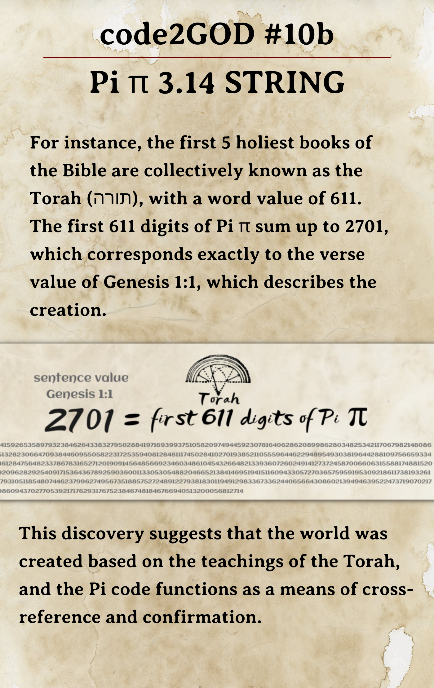 For instance, the first five holiest books of the Bible are collectively known as the Torah (תורה), with a word value of 611. The first 611 digits of Pi π sum up to 2701, which corresponds exactly to the verse value of Genesis 1:1 that describes the creation.