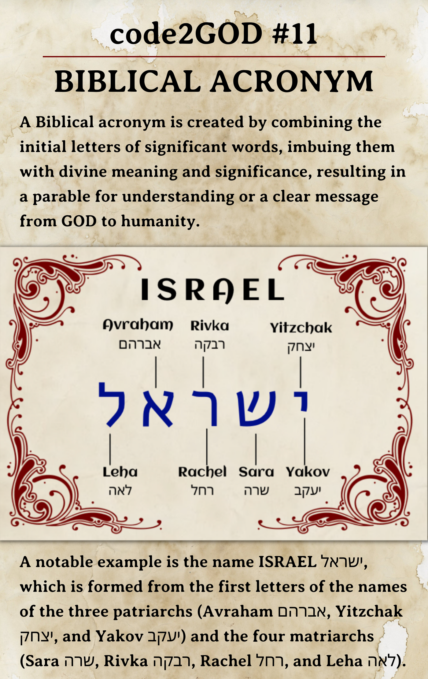 A notable example is the name ISRAEL ישראל, which is formed from the first letters of the names of the three patriarchs (Avraham אברהם, Yitzchak יצחק, and Yakov יעקב) and the four matriarchs (Sara שרה, Rivka רבקה, Rachel רחל, and Leha לאה).
