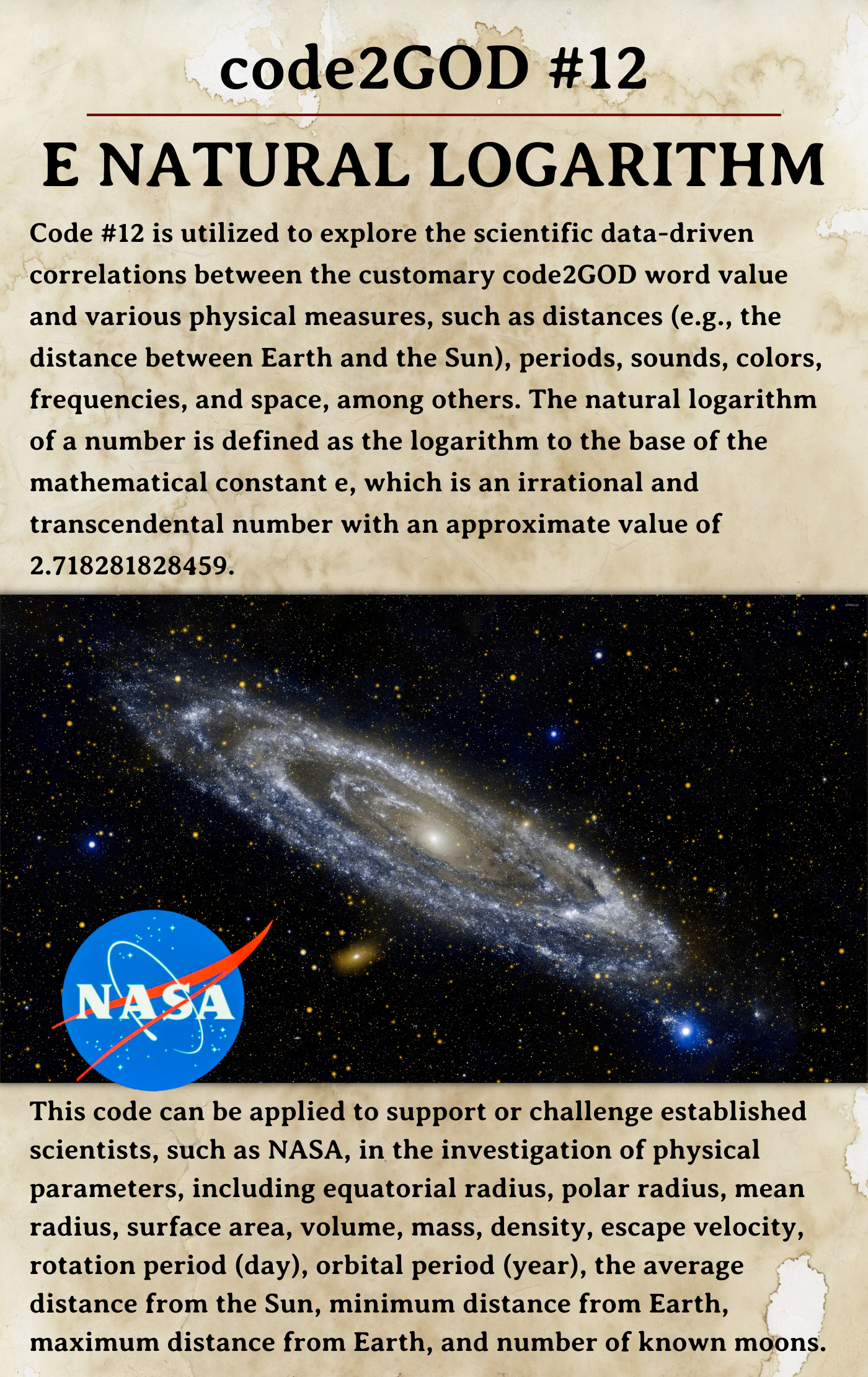 code2GOD #12 is utilized to explore the scientific data-driven correlations between the customary code2GOD word value and various physical measures, such as distances (e.g., the distance between Earth and the Sun), periods, sounds, colors, frequency, and space, among others. The natural logarithm of a number is defined as the logarithm to the base of the mathematical constant e, which is an irrational and transcendental number with an approximate value of 2.718281828459.