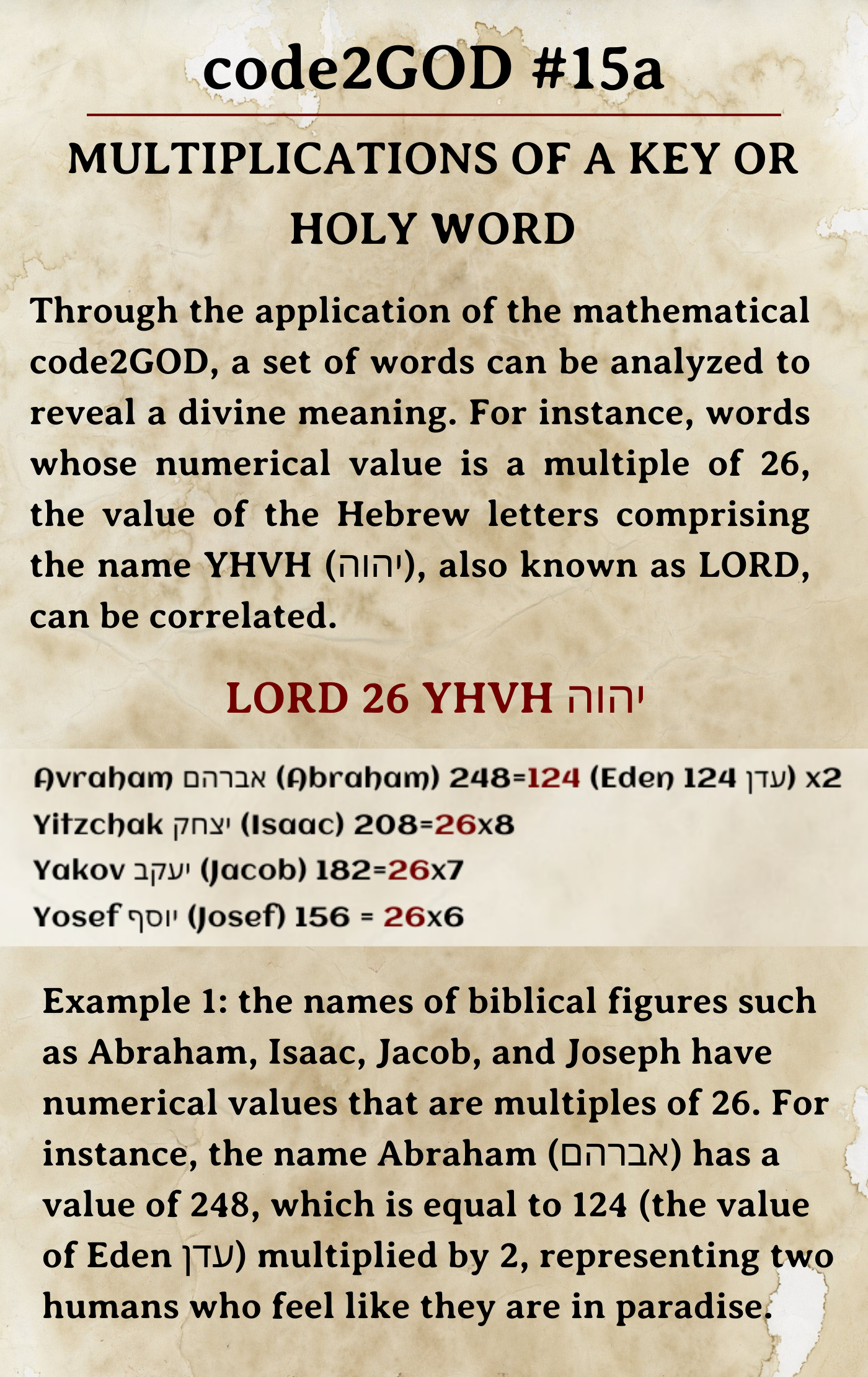 Example 1: Avraham אברהם (Abraham) 248=124 (Eden 124 עדן) x2 (two humans to feel like “Eden”) Yitzchak יצחק (Isaac) 208=26x8 Yakov יעקב (Jacob) 182=26x7 Yosef יוסף (Josef) 156 = 26x6