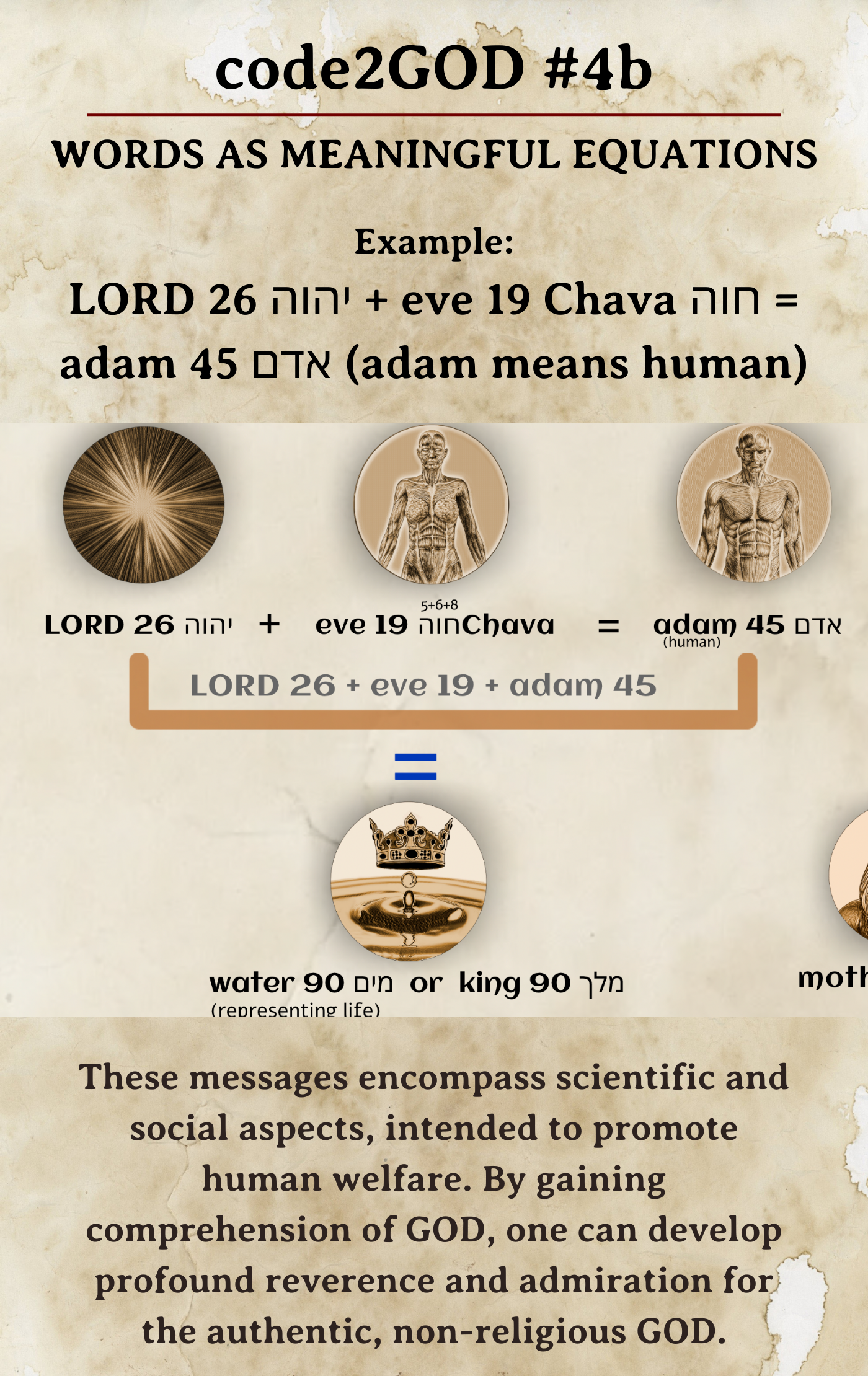 The value of each word, as determined by the sum of the letters’ codes, is utilized in mathematical equations to extract divine messages pertaining to the design of the world and the purpose of human existence. These messages encompass scientific and social aspects, intended to promote human welfare. By gaining comprehension of GOD, one can develop profound reverence and admiration for the authentic, non-religious GOD.