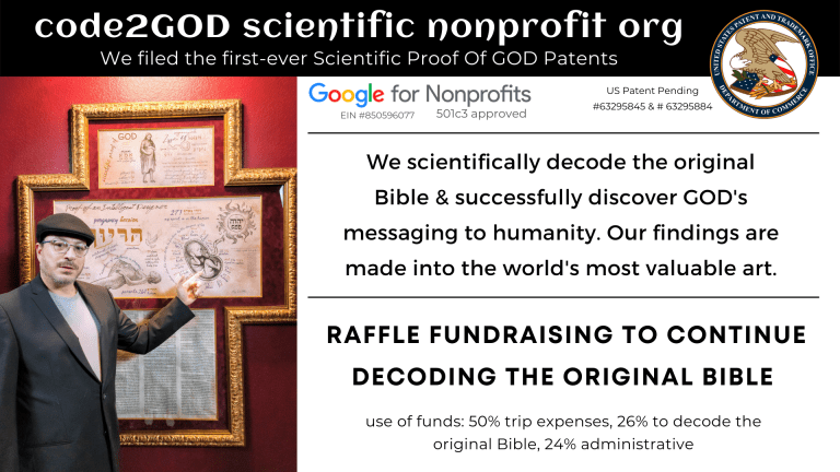 We’re code2GOD an approved scientific nonprofit org #850596077 (IRS confirmation). We scientifically & successfully decode the original Bible to discover GOD’s messaging to humanity. We filed the first-ever patent for the scientific proof of GOD. We also turned it into the world’s most valuable art piece. See code2GOD.org